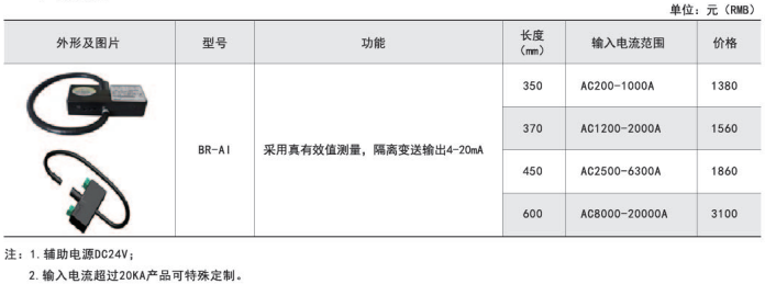 BR-AI 采用真有效值測量, 隔離變送輸出4-20mA 350 AC200-1000A