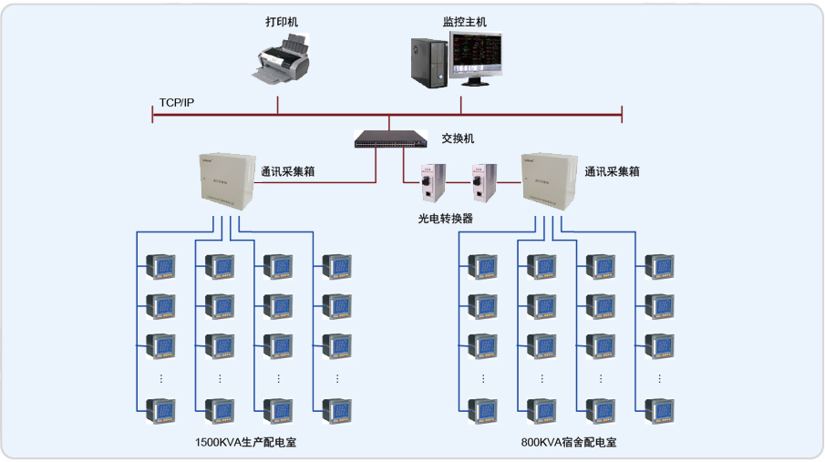 山東電力管道工程公司有兩個(gè)配電室:容量1500KVA的生產(chǎn)配電室和800KVA的宿舍配電室,兩個(gè)配電室距離約1500米,為實(shí)現(xiàn)配電系統(tǒng)的規(guī)范化管 理,對(duì)舊的配電系統(tǒng)進(jìn)行改造,兩配電室內(nèi)的老式指針式儀表更換為上海安科瑞公司的網(wǎng)絡(luò)電力儀表,配套Acrel-2000電力監(jiān)控軟件對(duì)現(xiàn)場(chǎng)進(jìn)行監(jiān)控,監(jiān)控室位于生產(chǎn)配電室內(nèi)。為滿足兩個(gè)配電室統(tǒng)一監(jiān)控的要求,容量1500KVA的生產(chǎn)配電室和800KVA的宿舍配電室通過(guò)一根單模四芯的光纖相連,經(jīng)光電轉(zhuǎn)換后接入網(wǎng)絡(luò)交換機(jī),進(jìn)而實(shí)現(xiàn)對(duì)現(xiàn)場(chǎng)數(shù)據(jù)的采集,存儲(chǔ),處理,實(shí)時(shí)顯示以及歷史查詢。