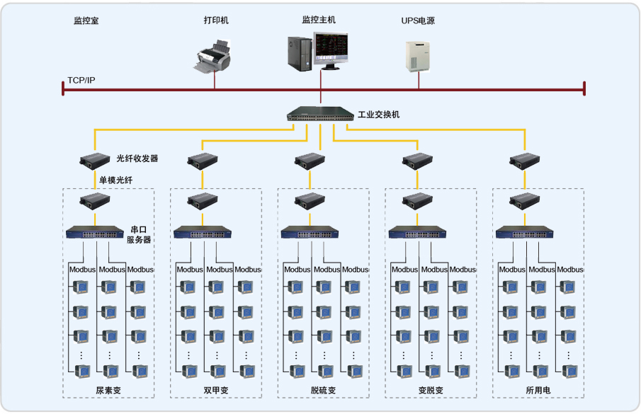 中化平原電力監控系統現場分為5個低壓配電室,配電室內采用安科瑞PZ系列電力監控儀表采集各回路的電流、電壓、電能等電參量,然后通過中間層采集設備經光纖傳到監控室計算機上,實現遙測、遙信功能。