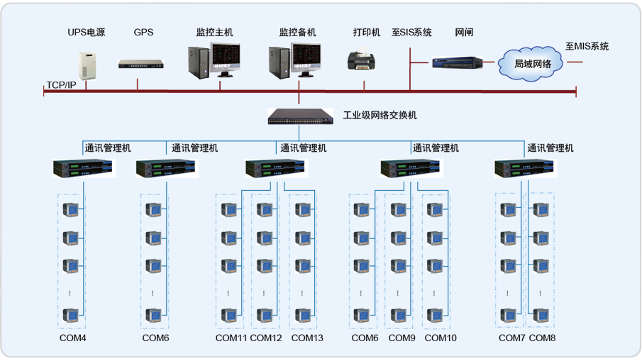 為了能實(shí)現(xiàn)對電廠電能量數(shù)據(jù)進(jìn)行自動(dòng)采集、遠(yuǎn)傳和存儲(chǔ)、預(yù)處理、線損統(tǒng)計(jì)及分析的電能綜合管理平臺(tái),合肥電廠電能量管理系統(tǒng)采用了Acrel-3000電能管理軟件,通過現(xiàn)場總線把現(xiàn)場的電能儀表進(jìn)行集中管理,做到了自動(dòng)采集、集中控制、智能管理。同時(shí)本電能管理系統(tǒng)還具備同廠內(nèi)SIS(監(jiān)控信息系統(tǒng))以及MIS(管理信息系統(tǒng))共享。