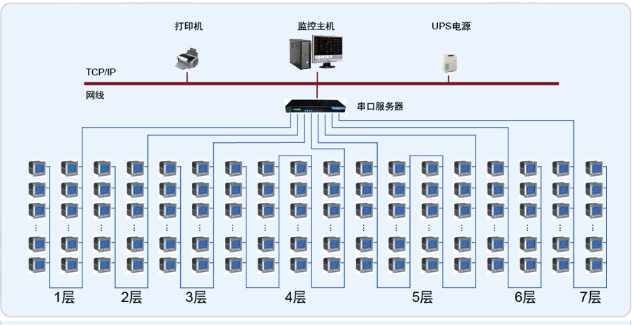 本項目電力監(jiān)控系統(tǒng)采用分布式結(jié)構(gòu),為現(xiàn)場層、通訊層和后臺監(jiān)控層。現(xiàn)場層指分布于于各樓層動力箱及地下配電室內(nèi)的安科瑞系列儀表,通訊層包括NPORT5630-16串口服務器、網(wǎng)絡交換機等,后臺監(jiān)控層包括計算機、打印 機、UPS電源等。通訊層及后臺監(jiān)控層都位于地下監(jiān)控室內(nèi)。現(xiàn)場所有安科瑞系列儀表通過屏蔽雙絞線拉到地下監(jiān)控室內(nèi),與串口服務器相連,經(jīng)交換機與計算機連接,實現(xiàn)數(shù)據(jù)采集。